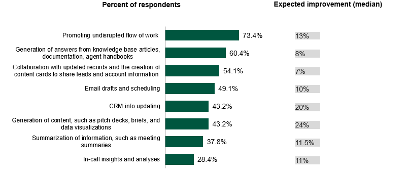 The survey asked about individual sales metrics. The chart below shows the percentage of respondents who expect their organization to realize the benefit during the next 12 months and the expected level of improvement.